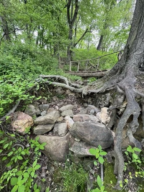 Hardscape elements that support land use (paths, seating, simple patios, natural stone features)